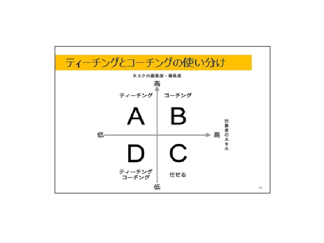 コーチ:引出す人⇒コーチング:相手から能力、可能性、動機などを引出す。やり方や答えは教えない。