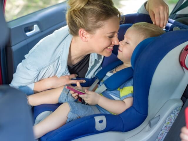 ・乳児は車内では常に車の後部座席で後ろ向きのベビーシートに乗せます。